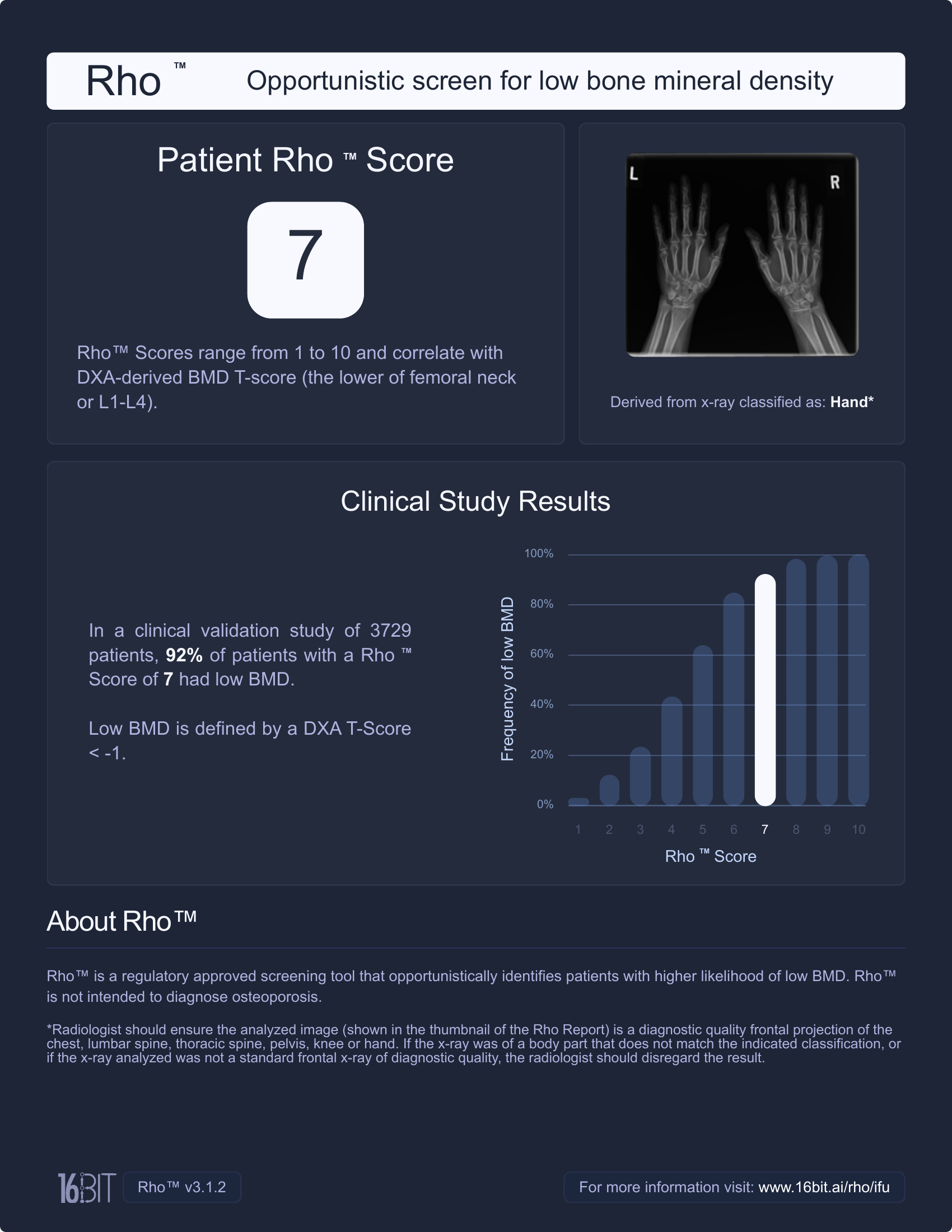 If a patient’s X-Ray shows signs suggesting low BMD, RhoTM generates a proactive rating that is included with the radiologist’s findings.
